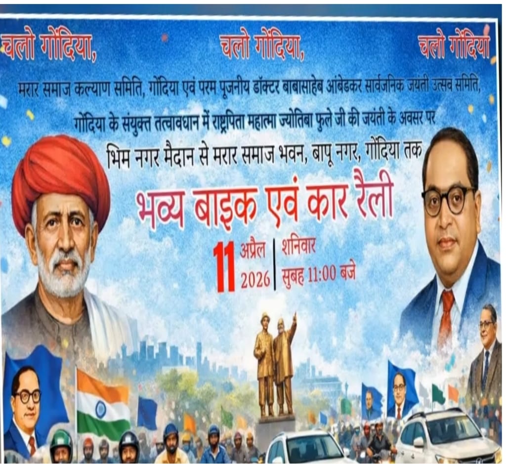 गोंदिया : मरार समाज कल्याण समिती व प.पू. डॉ. बाबासाहेब आंबेडकर सार्वजनिक जयंती उत्सव समिती गोंदियाच्यावतीने महात्मा ज्योतिबा फुले व डॉ बाबासाहेब आंबेडकर जयंतीनिमित्त गोंदिया येथे शनिवार, ११ एप्रिल २०२६ रोजी भव्य बाईक रॅली काढण्यात येणार आहे. बाईक रॅलीची सुरूवात मरार समाज कल्याण समिती अध्यक्ष आत्माराम पाचे व प.पू. डॉ. बाबासाहेब आंबेडकर सार्वजनिक जयंती उत्सव समिती अध्यक्ष अरविंद भावे हे झेंडा दाखवून करण्यात येणार आहे. बाईक रॅलीची सुरुवात भीमनगर मैदानपासून संपूर्ण गोंदिया शहर ते मरारसमाज़ भवन, मरारटोली, बापूनगर गोंदिया येथे समापन करून मरारसमाज भवन गोंदिया येथे महात्मा ज्योतीबा फुले जयंती साजरी करण्यात येणार आहे. तरी सदर बाईक रॅली मध्ये बहुजन समाजातील पुरुष- महिला, तसेच सर्वांनी बहुसंख्येने उपस्थित राहावे, असे आवाहन मरार समाज व प.पू. डॉ. बाबासाहेब आंबेडकर सार्वजनिक जयंती उत्सव समिती गोंदियाच्यावतीने करण्यात आले आहे.