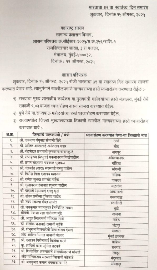 यावर्षी 18 जानेवारीला जिल्हानिहाय पालकमंत्र्यांची यादी जाहीर करण्यात आली होती. त्यानंतर लगेचच नाशिक आणि रायगडच्या पालकमंत्र्यांच्या नियुक्तीवर महायुतीतील मतभेदांमुळे स्थगिती देण्यात आली. रायगडसाठी राष्ट्रवादीच्या आदिती तटकरे आणि शिवसेनेच्या भरत गोगावले यांच्यात, तर नाशिकसाठी भाजपचे गिरीश महाजन आणि शिवसेनेचे दादा भुसे यांच्यात तणाव होता. हा वाद राज्यापासून दिल्लीपर्यंत गेला होता.नवीन यादीप्रमाणे रायगड जिल्हाधिकारी कार्यालयात ध्वजारोहणाचा मान अदिती तटकरे यांना मिळाला आहे. भरत गोगावले यांनाही पालकमंत्रीपदाची अपेक्षा होती, मात्र गेल्या आठवड्यात त्यांनी “मुख्यमंत्री, उपमुख्यमंत्री जे ठरवतील ते मान्य” असे वक्तव्य करून सौम्य भूमिका घेतली. त्यामुळे एकनाथ शिंदे यांच्या दिल्ली दौऱ्यानंतर तिढा सुटल्याची चर्चा राजकीय वर्तुळात आहे.नाशिक जिल्ह्यातील ध्वजारोहणाची जबाबदारी भाजप नेते व मंत्री गिरीश महाजन यांच्याकडे सोपवण्यात आली आहे. शिवसेनेचे दादा भुसे यांच्याशी असलेला वाद लक्षात घेता हा निर्णय महत्त्वाचा मानला जात आहे.उपमुख्यमंत्री आणि बीड जिल्ह्याचे पालकमंत्री अजित पवार यंदा स्वातंत्र्यदिनानिमित्त बीड येथे ध्वजारोहण करणार आहेत. पालकमंत्री पदाची जबाबदारी घेतल्यानंतर पहिल्यांदाच ते बीडच्या ध्वजारोहण सोहळ्यात सहभागी होणार आहेत. अलीकडील बीड दौऱ्यात त्यांनी जिल्ह्याच्या विकासासाठी कटिबद्ध असल्याचे सांगत गुन्हेगारांना थेट इशारा दिला होता.राज्यातील 34 जिल्ह्यांमधील ध्वजारोहण सोहळ्यांसाठी कोणत्या जिल्ह्यात कोण मंत्री उपस्थित राहणार याची संपूर्ण यादी राज्य सरकारने प्रसिद्ध केली आहे.